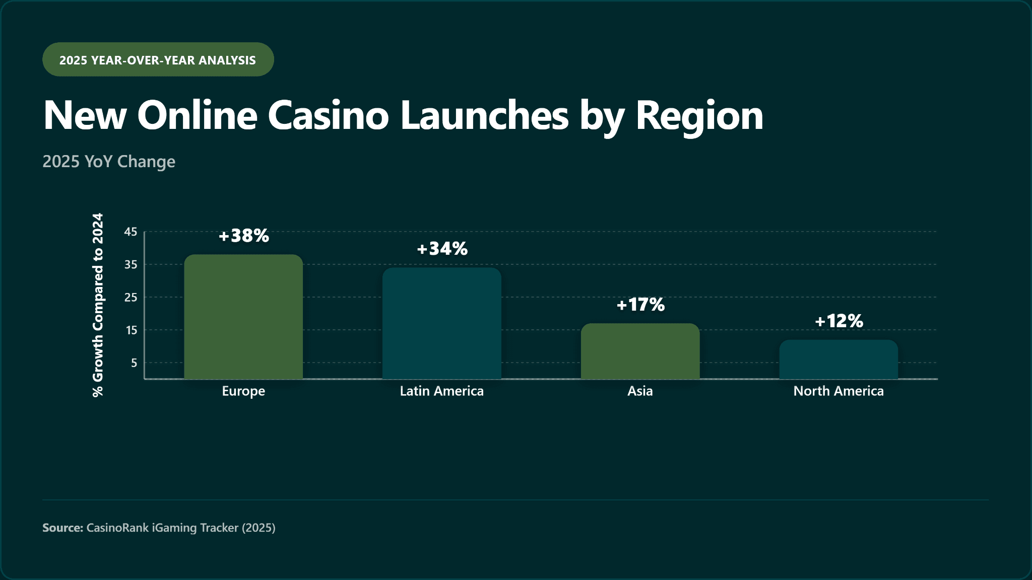 This chart shows regional growth in new casino launches during 2025. Europe and Latin America led the expansion, while Asia and North America saw more limited activity.