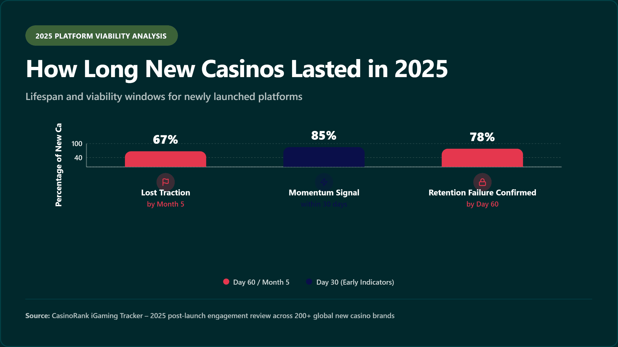 This timeline chart highlights how fast new casinos failed to retain users in 2025. Platforms now face a 60-day survival threshold, with viability judged by day 30.